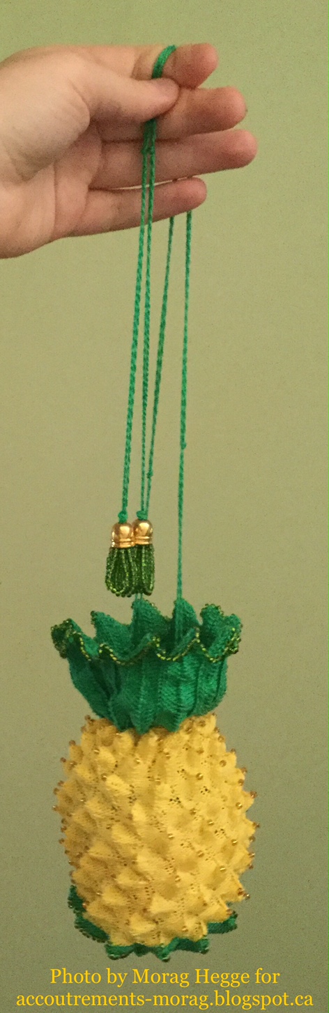 my Pineapple Purse. The resulting width actually seemed to not be all that different from the widths in dimension descriptions I had found for these purses on various museum sites, so this must be a decent gauge to work in. The Raised French stitch described here is essentially a pattern of a round of alternating decreases and open/increase stitches, followed by three rounds of plain knitting (arrgh, now I'm beginning to talk like this book!! I mean stocking stitch).